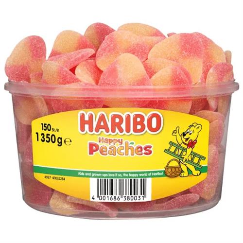 Klaar voor vrolijk fruitig genieten? dan zijn Haribo Happy peaches precies wat je zoekt. Onze zachte snoep perziken zijn zoet, zacht en zalig lekker. Nog meer perzik? onmogelijk.