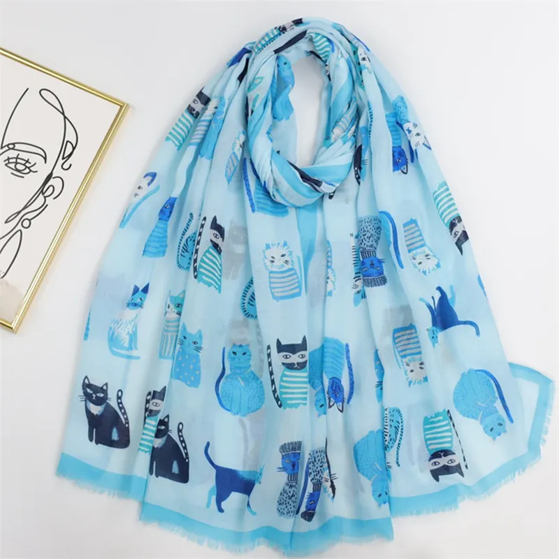 Heerlijk grote en zachte sjaal in blauwtinten met een vrolijke allover kattenprint. Deze sjaal is gemaakt van een zachte en warme katoen / polyester mix, en heeft een afmeting van 90x180cm.