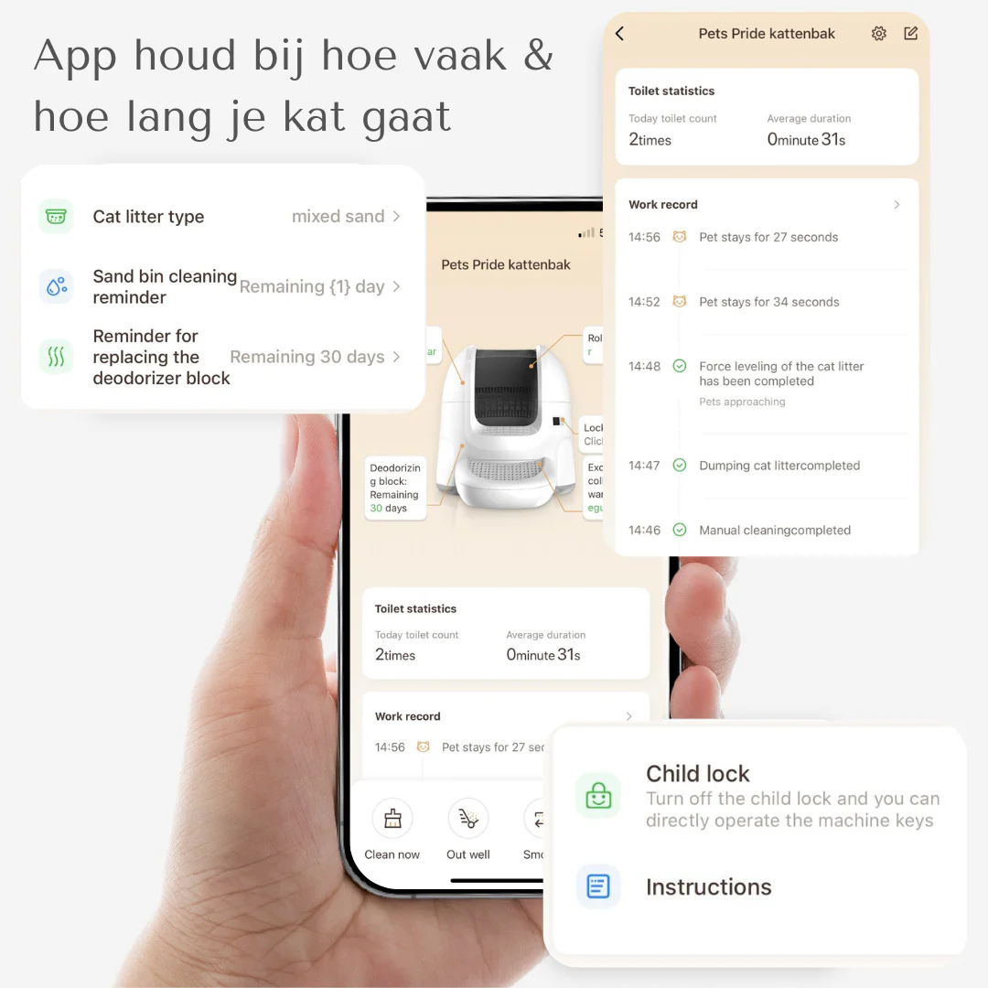 - Onjuist geplaatste bak of afwijkingen? De kattenbak pauzeert en geeft een waarschuwing.